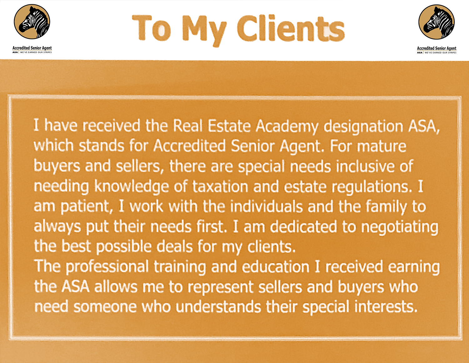 “I am patient, I work with the individuals and the family to always put their needs first. I am dedicated to negotiating the best possible deals for my clients. The professional training and education I received earning the ASA allows me to represent sellers and buyers who need someone who understands their special interests.”